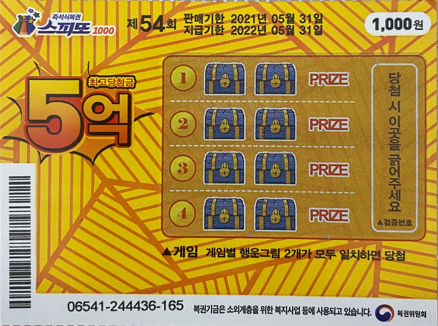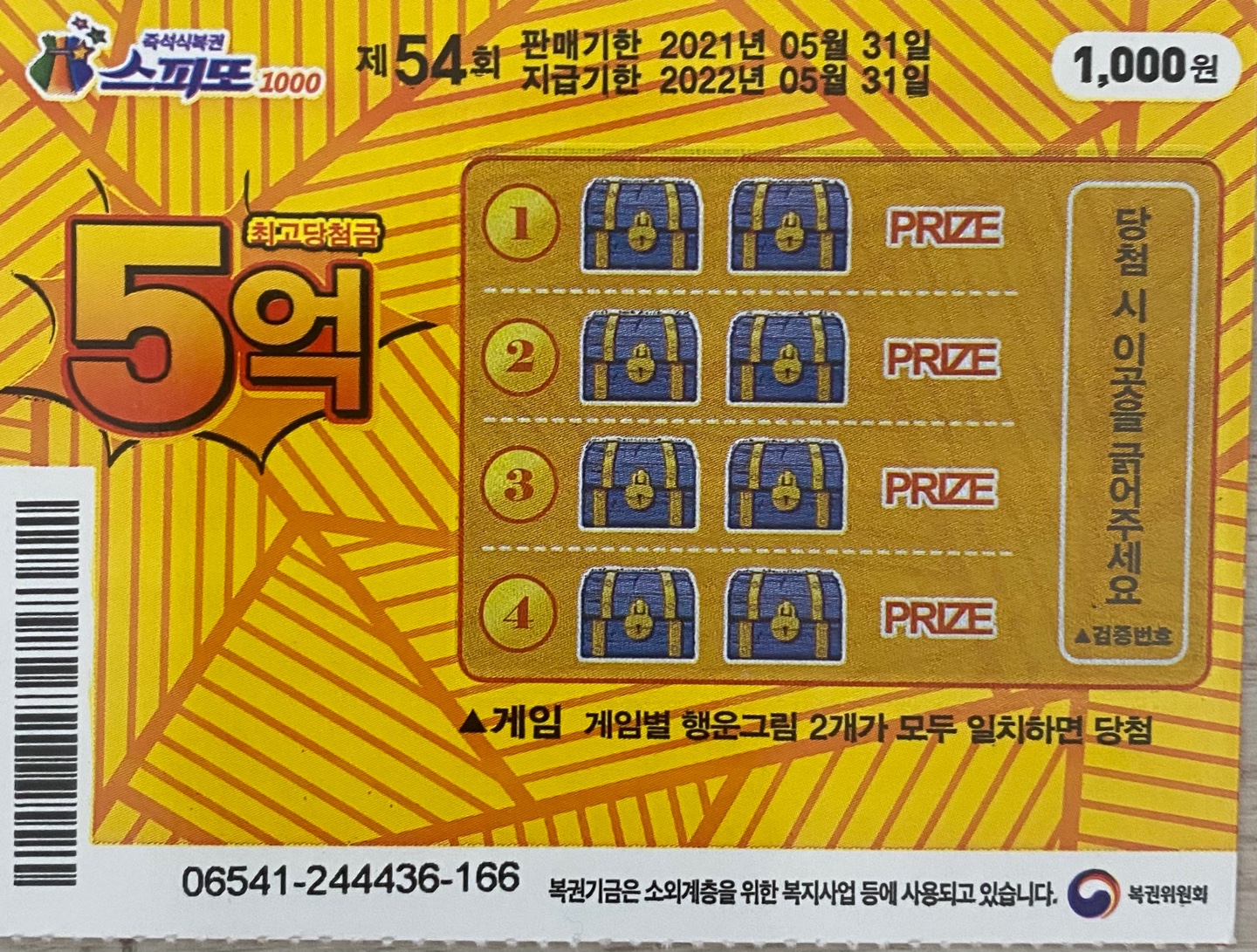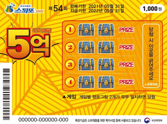노란색 바탕에 보물상자 게임모양이 굉장히 인상적인 스피또 1000 54회차의 경우는 총 5000만매가 발매되며 4개의 게임중 한 개의 게임의 그림 2개가 모두 일치하면 당첨이되는 방식의 게임입니다. 회차마다 당첨 매수나 게임 방식이 달라지는 특징을 가지고 있는데 54회차의 경우는 그림이 일치하는 방식입니다.